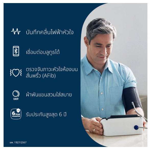 เครื่องบันทึกคลื่นไฟฟ้าหัวใจ (ECG) และวัดความดันโลหิตบนต้นแขน รุ่น complete (HEM-7530T) แสดงผลการตรวจคลื่นไฟฟ้าหัวใจ (ECG) และการตรวจความดันโลหิตทั้งสองค่าพร้อมกันในการใช้งานครั้งเดียว ช่วยชี้สัญญาณความผิดปกติที่อาจนำไปสู่ปัญหาหัวใจที่รุนแรงมากขึ้นได้ตั้งแต่เนิ่นๆ สามารถตรวจคัดกรองภาวะหัวใจต่างๆ อย่างรวดเร็วในคราวเดียว รวมถึงความผิดปกติของจังหวะการเต้นของหัวใจ เช่น AFib, หัวใจเต้นเร็ว, หัวใจเต้นช้า และความดันโลหิตสูง เป็นต้น แสดงผลลัพธ์ที่ชัดเจนและเข้าใจง่ายในแอป OMRON connect เพื่อแชร์ข้อมูลกับแพทย์ของคุณ